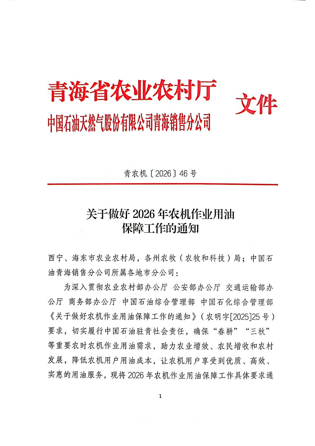 青海省农业农村厅关于做好2026年农机作业用油保障工作的通知